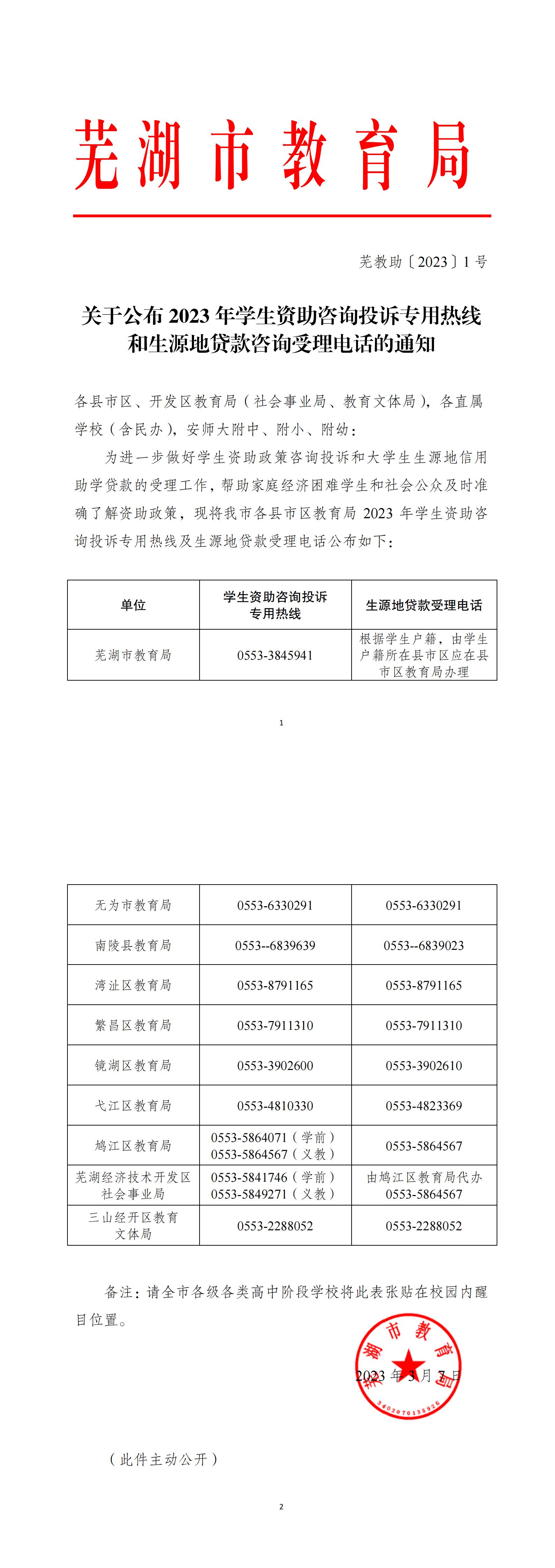 关于公布 2023 年学生资助咨询投诉专用热线和生源地贷款咨询受理电话的通知