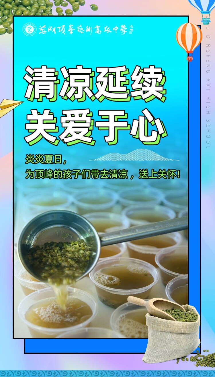 夏日清凉 关怀于心 消暑绿豆汤 ,熨帖学子心。连日的高温天气里,顶峰的学子们为了自己的梦想仍在努力坚持奋斗着。为了让孩子们消暑解渴,防火降温,我校特别熬制了绿豆汤,送到每一个孩子的手里,让大家在炎炎夏日里感受到清凉与蕴藉。 一碗小小的绿豆汤,让孩子们甜在舌尖,甜在心里,消除了疲惫。欢声笑语间,大家有了更加强大的动力、更加充足的精力投入到梦想的战斗中去。