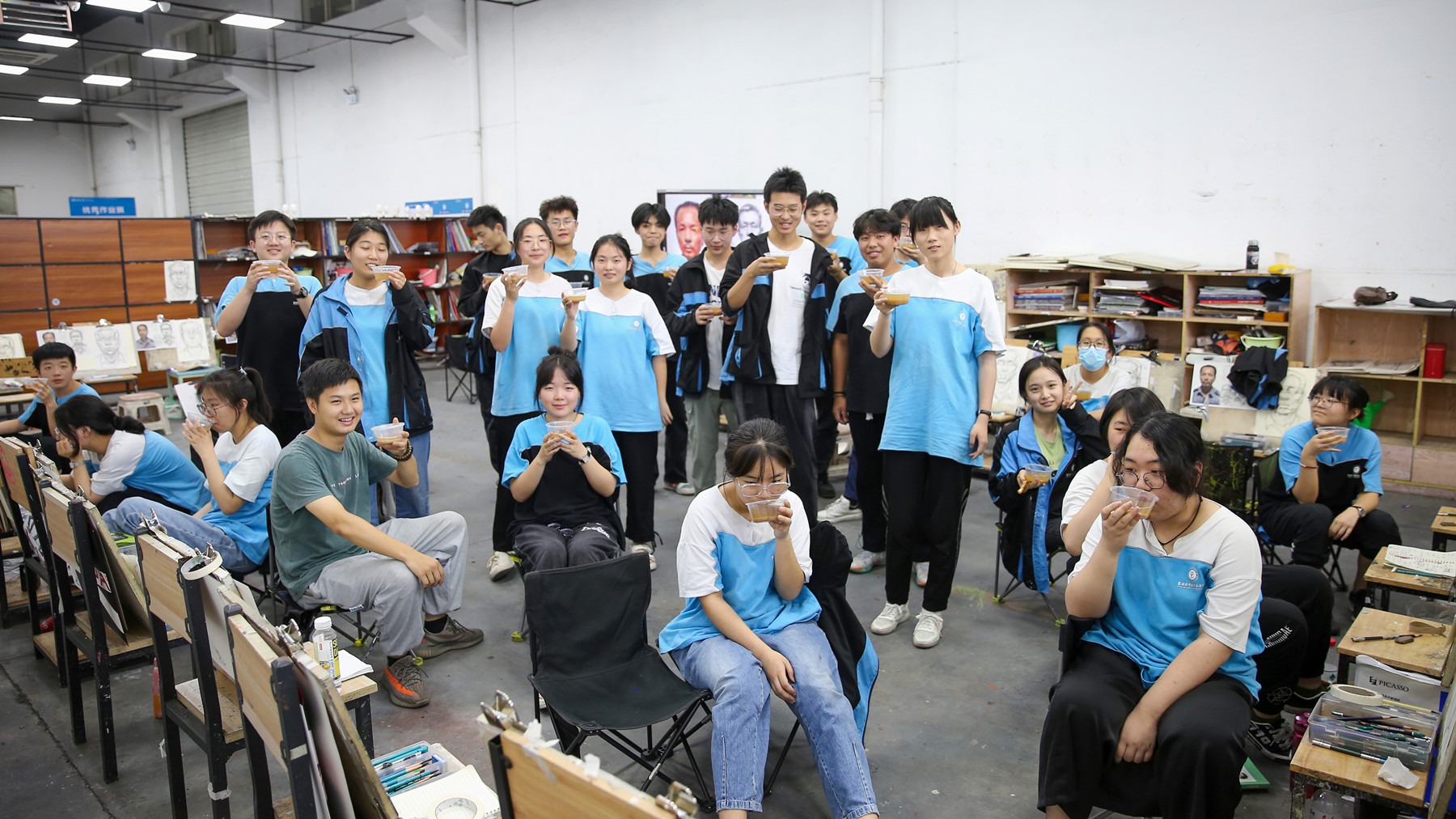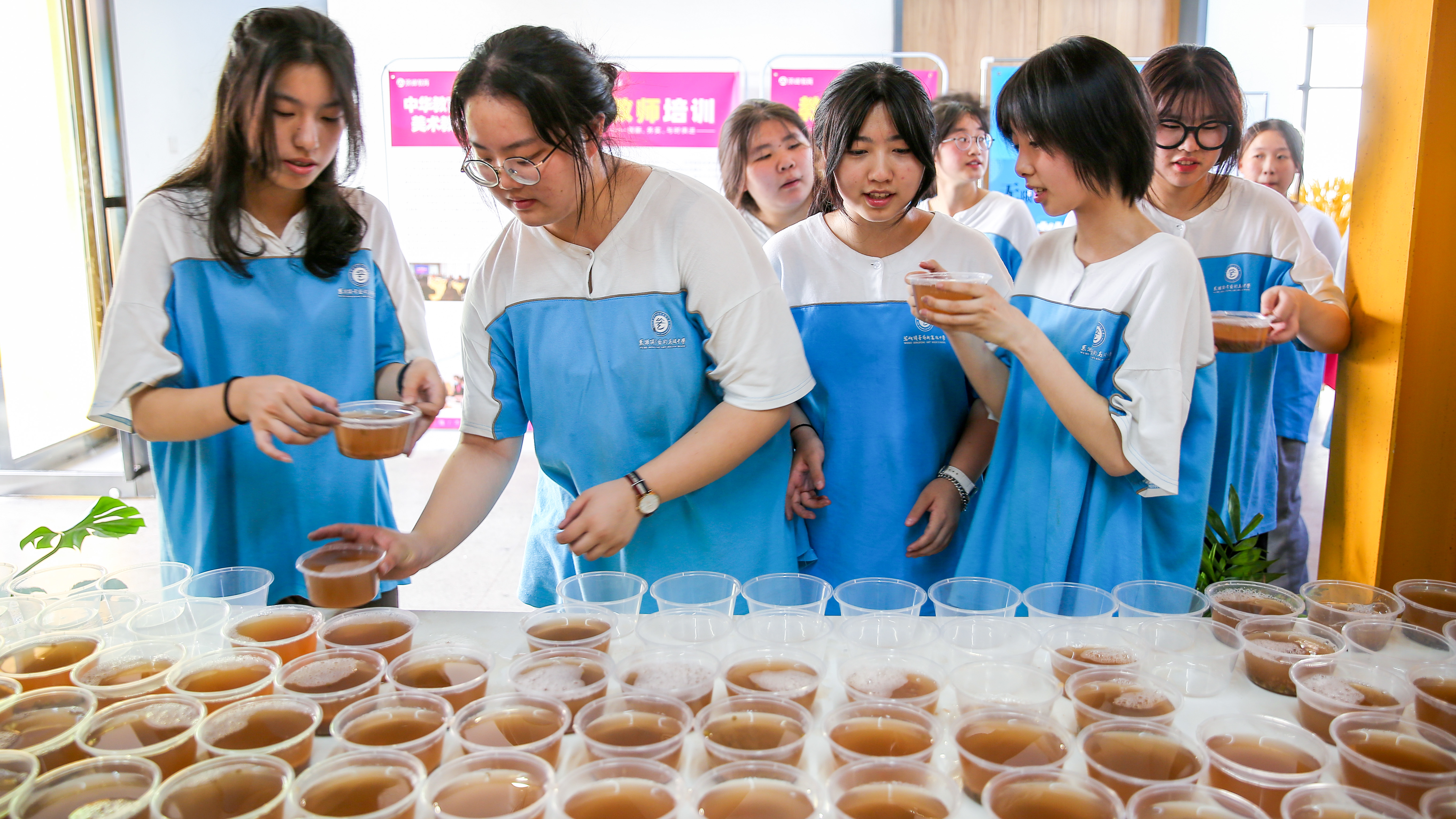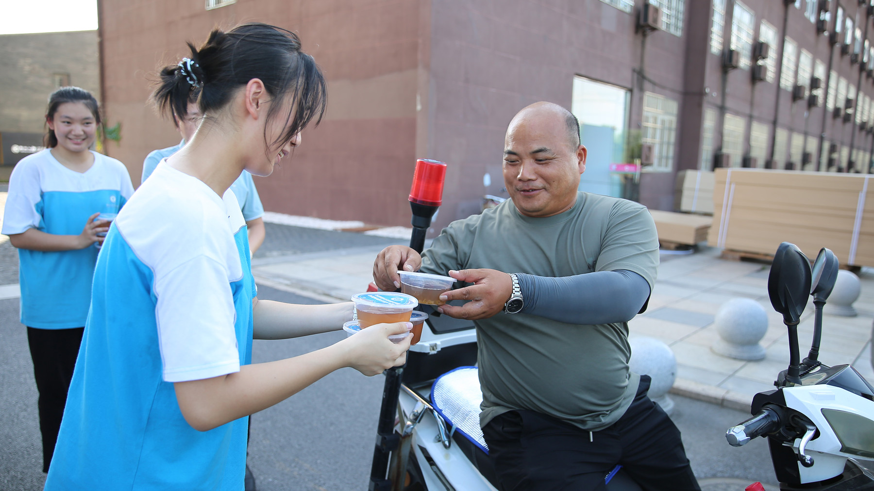 清凉解渴的绿豆汤,经由食堂后勤的阿姨们几个小时的熬制,再由老师们将绿豆汤搬运到画室,一份份盛好,最后送到孩子们的手中。