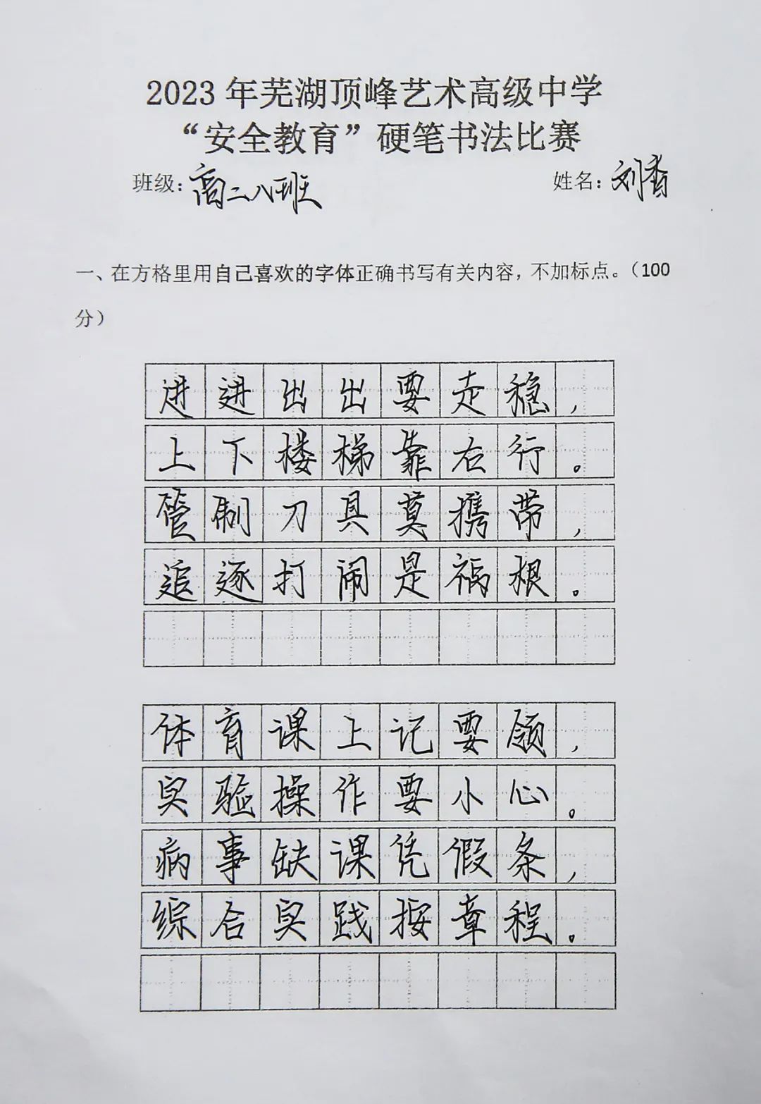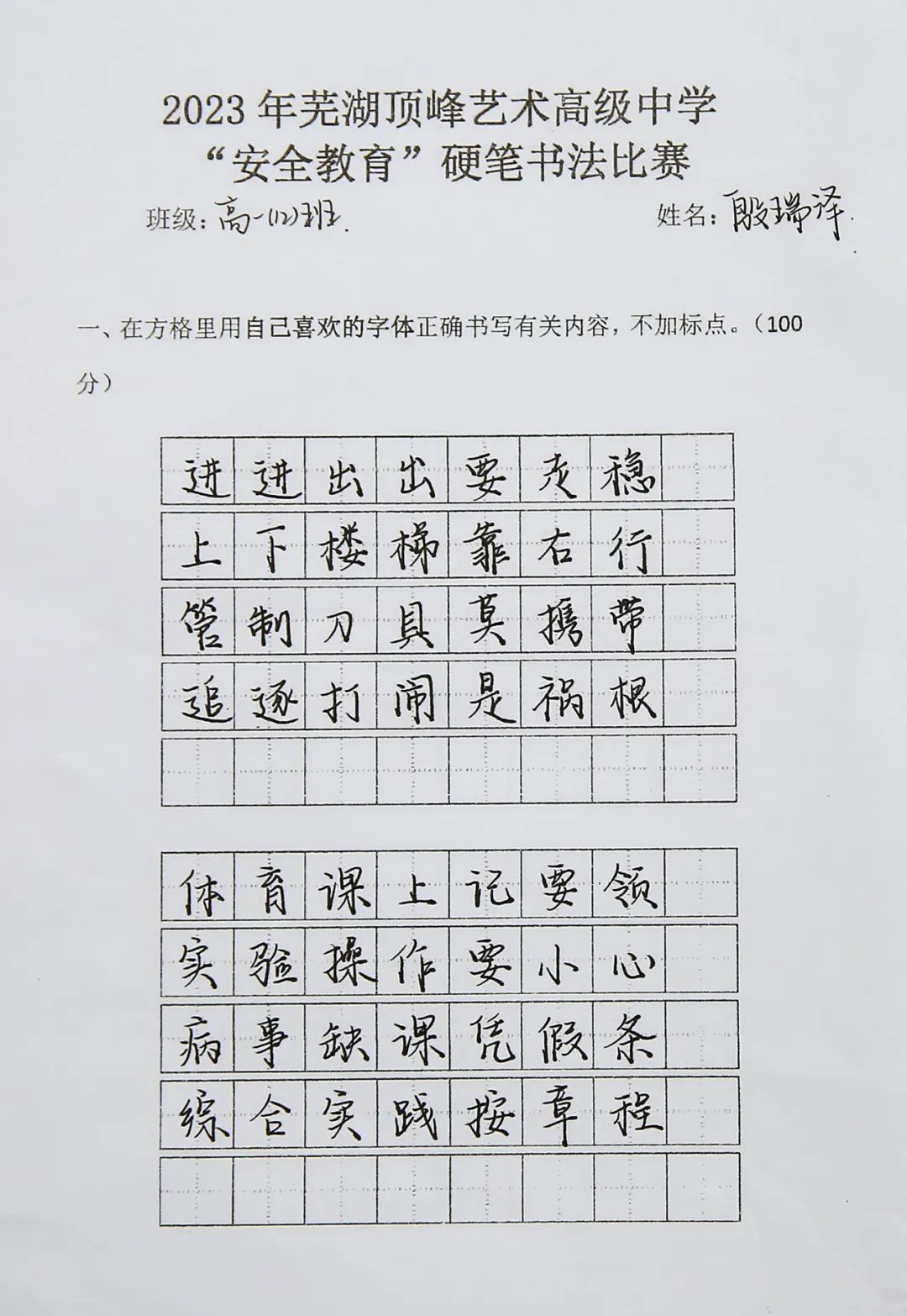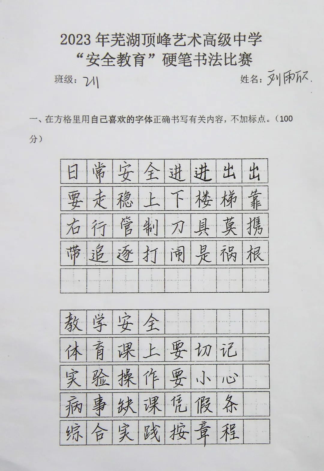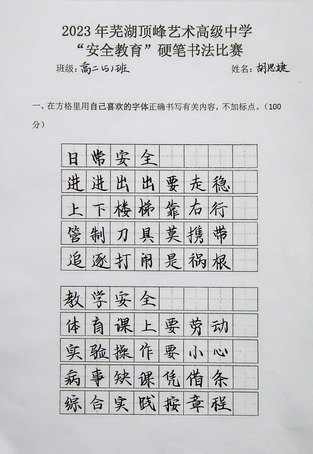 为持续加大对国家安全知识宣传学习的力度,增强学生的安全意识,激发学生对硬笔书法的兴趣,提高审美素养和文化素养,3月27日组织以安全教育为主题的书法比赛,高一高二两个年级全体学生参与评比。