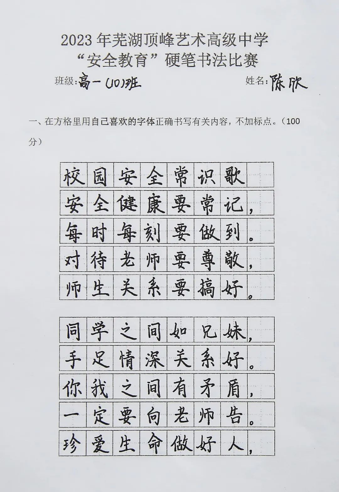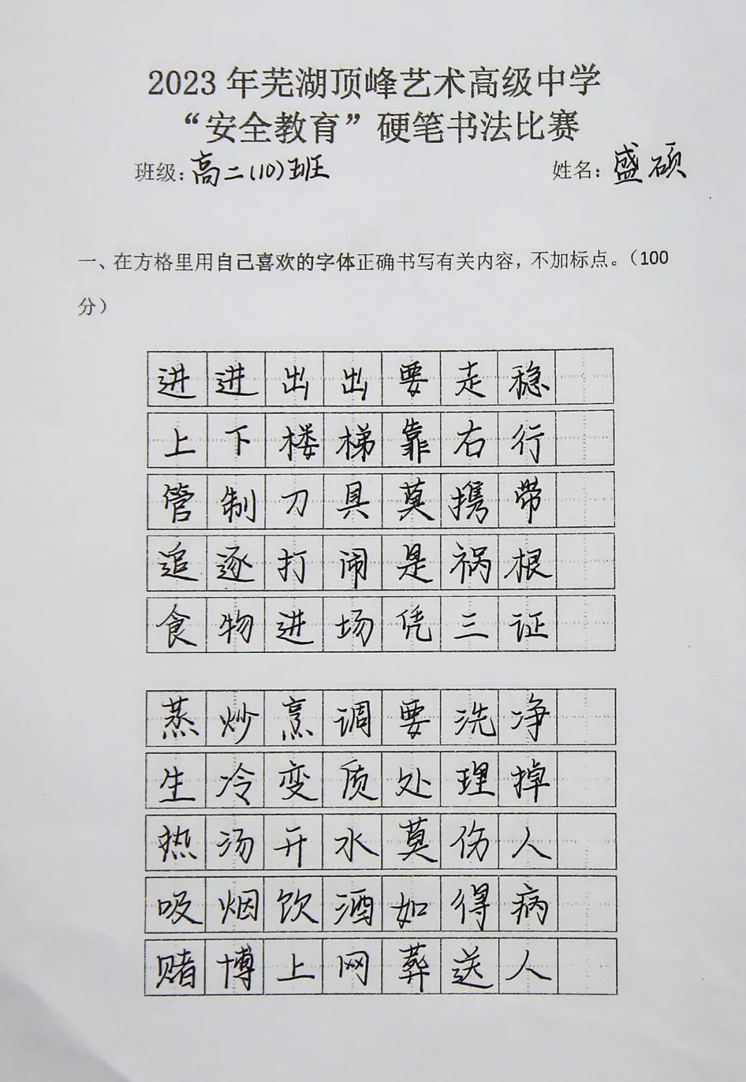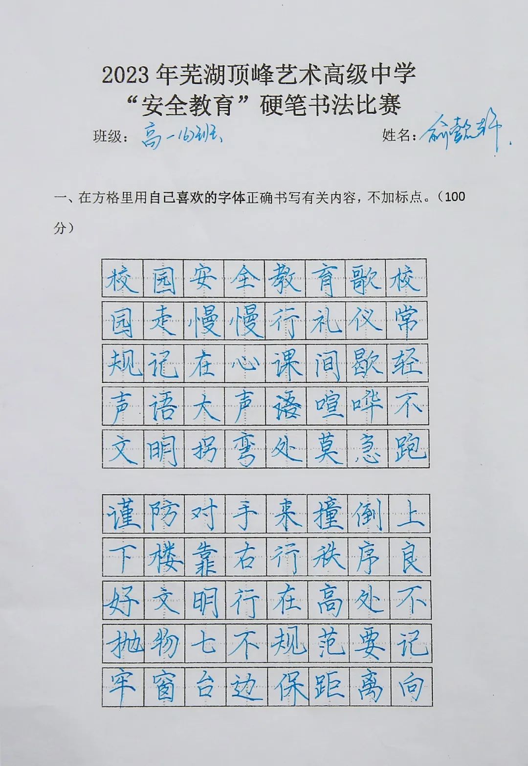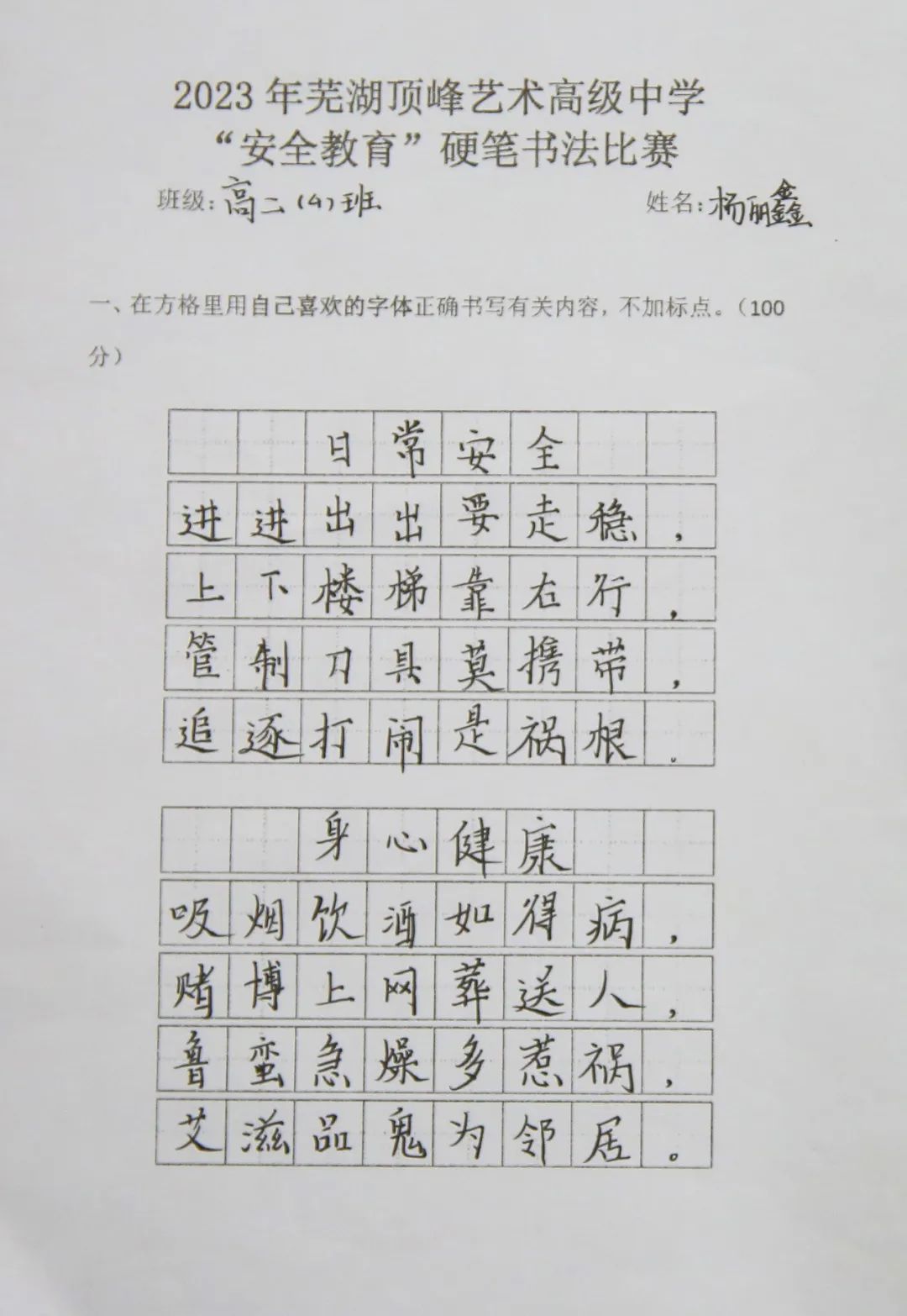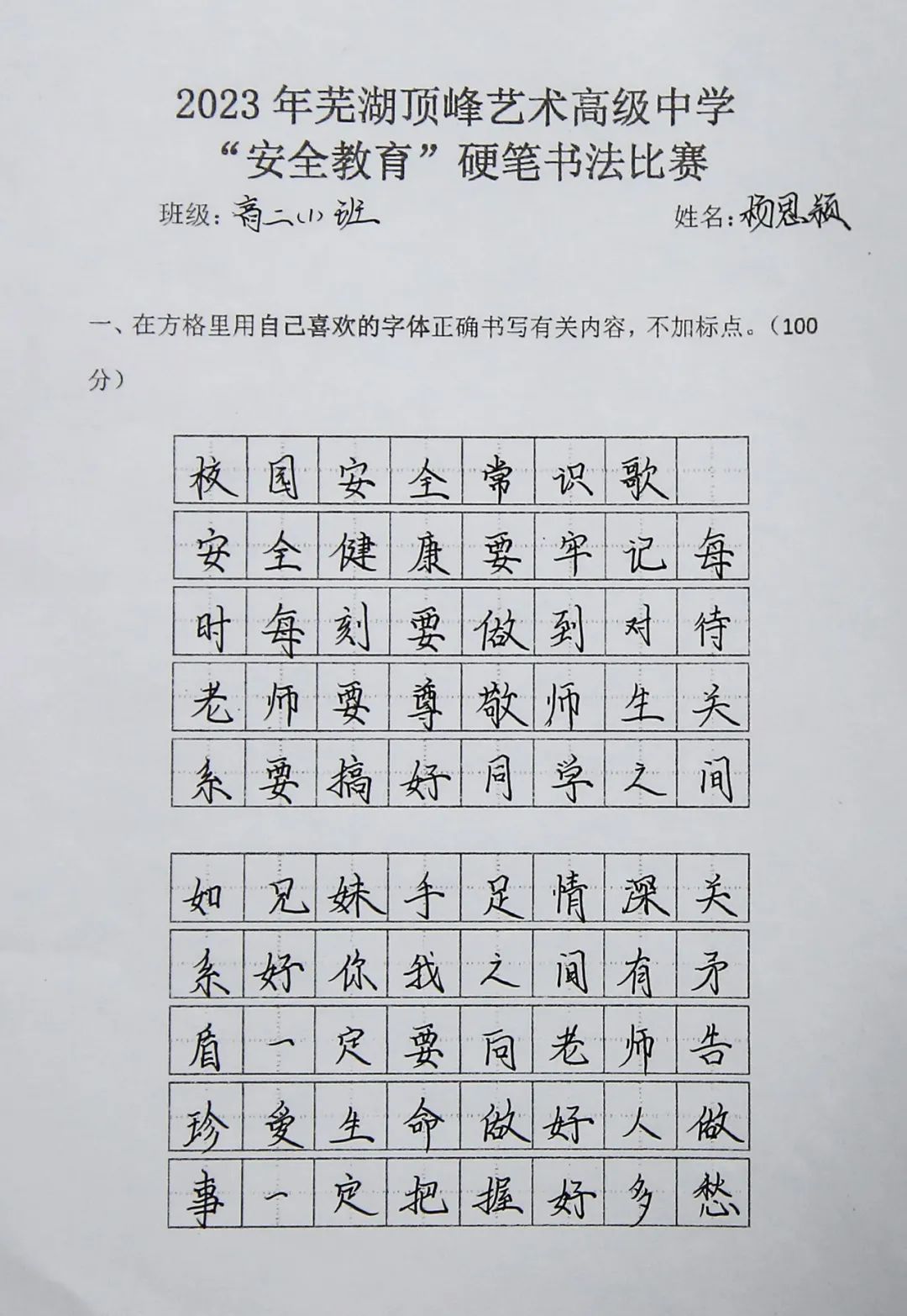 为持续加大对国家安全知识宣传学习的力度,增强学生的安全意识,激发学生对硬笔书法的兴趣,提高审美素养和文化素养,3月27日组织以安全教育为主题的书法比赛,高一高二两个年级全体学生参与评比。