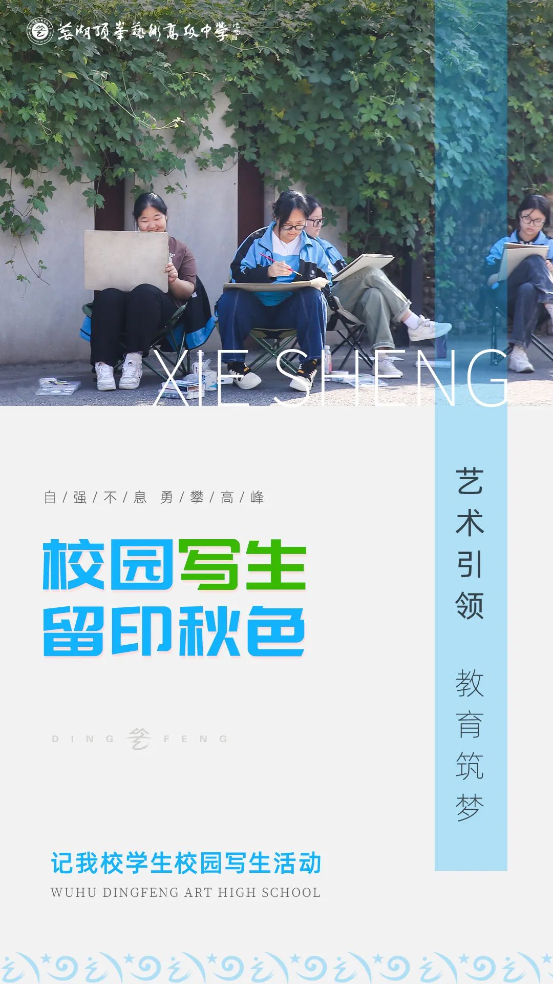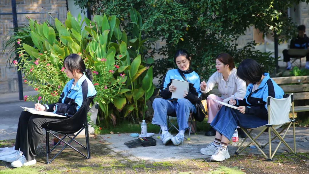 灵感演绎精彩,艺术滋养人生。 10月12日, 我校的学子们走出教室,迈向校园, 开展了校园写生活动。 同学们在和煦的阳光下亲近自然, 临摹校园之美, 捕捉诗意秋景, 感受艺术乐趣, 漫步顶峰校园 一砖一瓦皆是艺术 一花一木皆是风景 顶峰学子们 用一双双专注的眼睛 亲近自然、观察自然 捕捉校园中蕴藏的色彩美 绘心中美景,写秋日风物