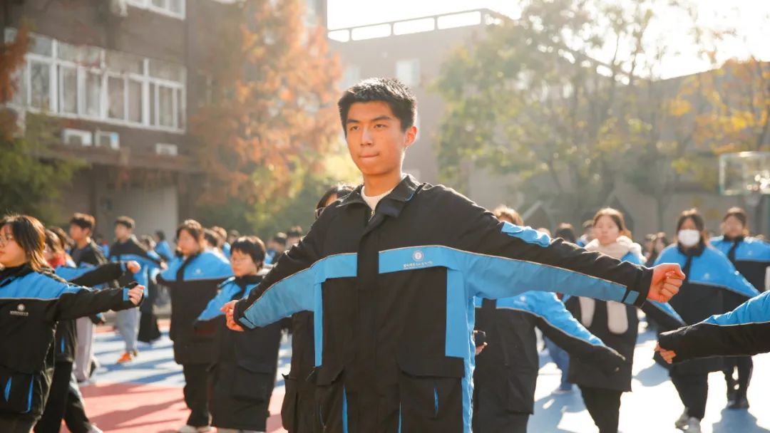 跑操结束后,同学们汇聚到操场指定地点列队集合,伴随着“第九套全国中学生广播体操舞动青春现在开始”的音乐响起,同学们一伸手、一抬腿、一弯腰、一曲肘,每一个动作都刚劲有力,完美诠释了力与美的结合。阳光洒在同学们脸上,他们动作娴熟到位,张弛有度,充盈着刚健之美,洋溢着青春气息。