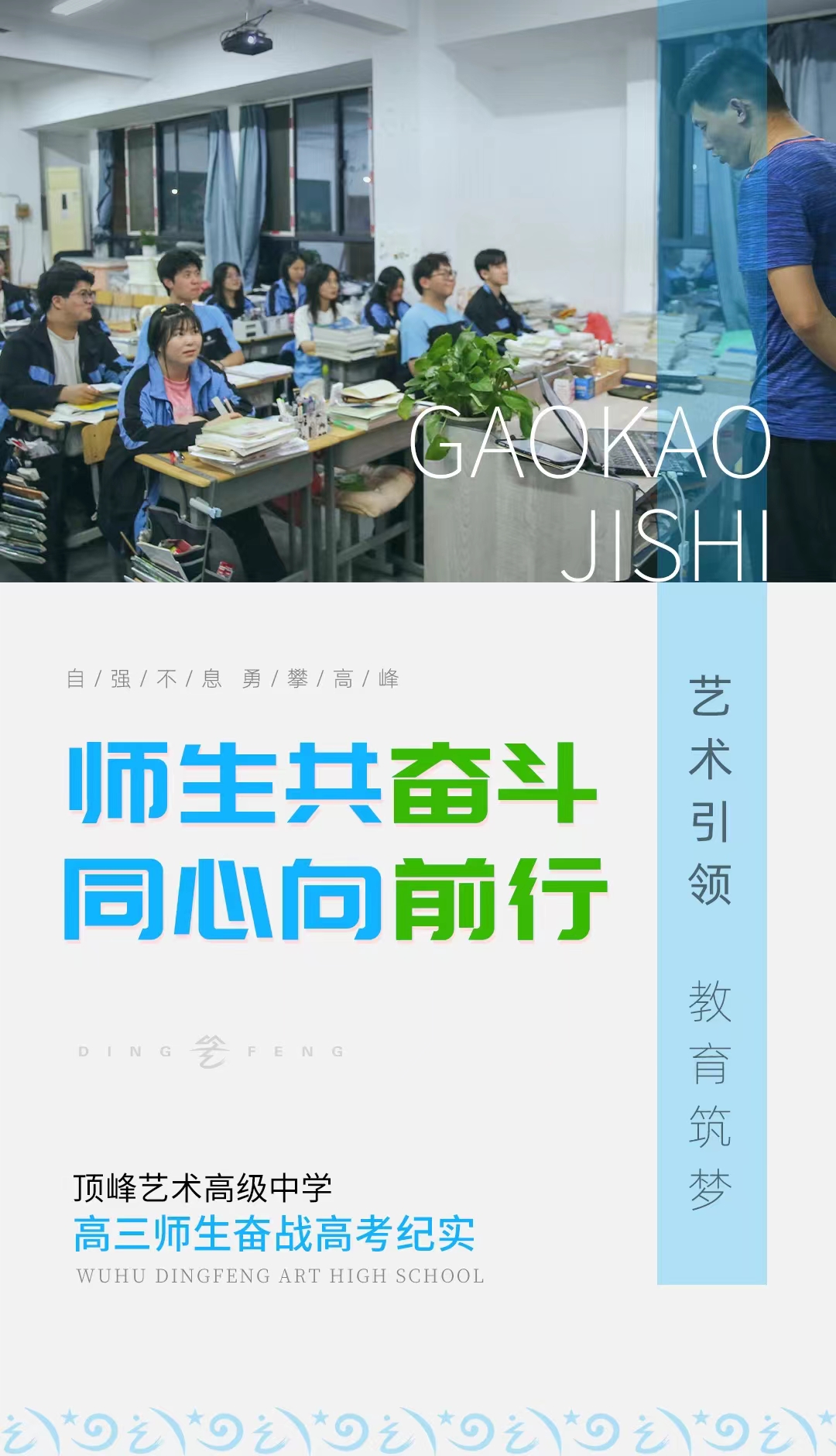 致顶峰2024届的你 WUHU DINGFENG ART HIGH SCHOOL 不负努力 不留遗憾 3年,1095个披星戴月的日日夜夜,高三的顶峰学子们怀揣着热忱初心,满载着青春拼搏,每一个努力的瞬间,每一次的全力以赴,都是你们向着梦想前进的见证。 在距2024年高考仅剩30天的时间里,让我们截取平常却又不平凡的日子中的一段铺展开来,寻找那些你们为梦奔跑的片段,看,你们坚定且认真的姿态,在这细碎的日子里闪闪发光。 自习时分,灯火通明。同学们上晚课查缺补漏,温故知新,开启沉浸式学习,每一个埋头苦学的身影,都充斥着“此处无声胜有声”的力量。 处处: 追梦身影 星光不负追梦人,江河眷顾奋楫者。清晨的第一缕曙光、夜空里的每一颗星星,校园路径边的草木、教室的每一张桌椅、顶峰校园的每一个角落,都在放映着你们努力追梦的身影,无奋斗,不青春! 定格: 奋斗痕迹 教学: 全程护航 课内课外坚守岗位的老师,是学生并肩的战友。每天,从早晨的晨读开始,到课上的循循善诱,再到晚自习的悉心辅导,竭心尽力答疑解惑,让有温度的教育只懂耕耘,不问收获。 教研: 合力共育 聚焦课堂,深耕教研。我校持续开展各类教研活动,不断地探索、研究教学重点、难点,反哺教学,提供更优质的教育。教学复习示范课上交流复习经验,升华教学内容,提高教学品质。 每次考试结束后,教务处组织开展成绩分析会。从各班级、各学科成绩出发,有针对性地对成绩进行分析。真正发现问题,总结经验,明确方向,寻求突破。 高考,看似孤勇者的拼搏,实则有太多温暖的陪伴。当同学沉浸于学习战斗中,直至忘记时间的流逝时,班主任总会陪伴你们到最后。或午休时光提醒吃饭休息,或深夜时分护送同学回寝,聆听学生的快乐与烦恼。 学而有疑,疑而从师,只要学生需要,长长的走廊,明亮的教室,处处都是加油站。学子交替侧立在师长身旁,一句句耐心细致的讲解,一声声细语良言的鼓励,在顶峰学子为梦奋进的征程中回响。 顶峰学子们不负青春壮志 必会无限接近梦想 在日复一日的努力中看到坚持的意义 天道酬勤,力耕不欺 / 我们相信 有志者一定事竟成 更相信上下同心者一定高考必胜!