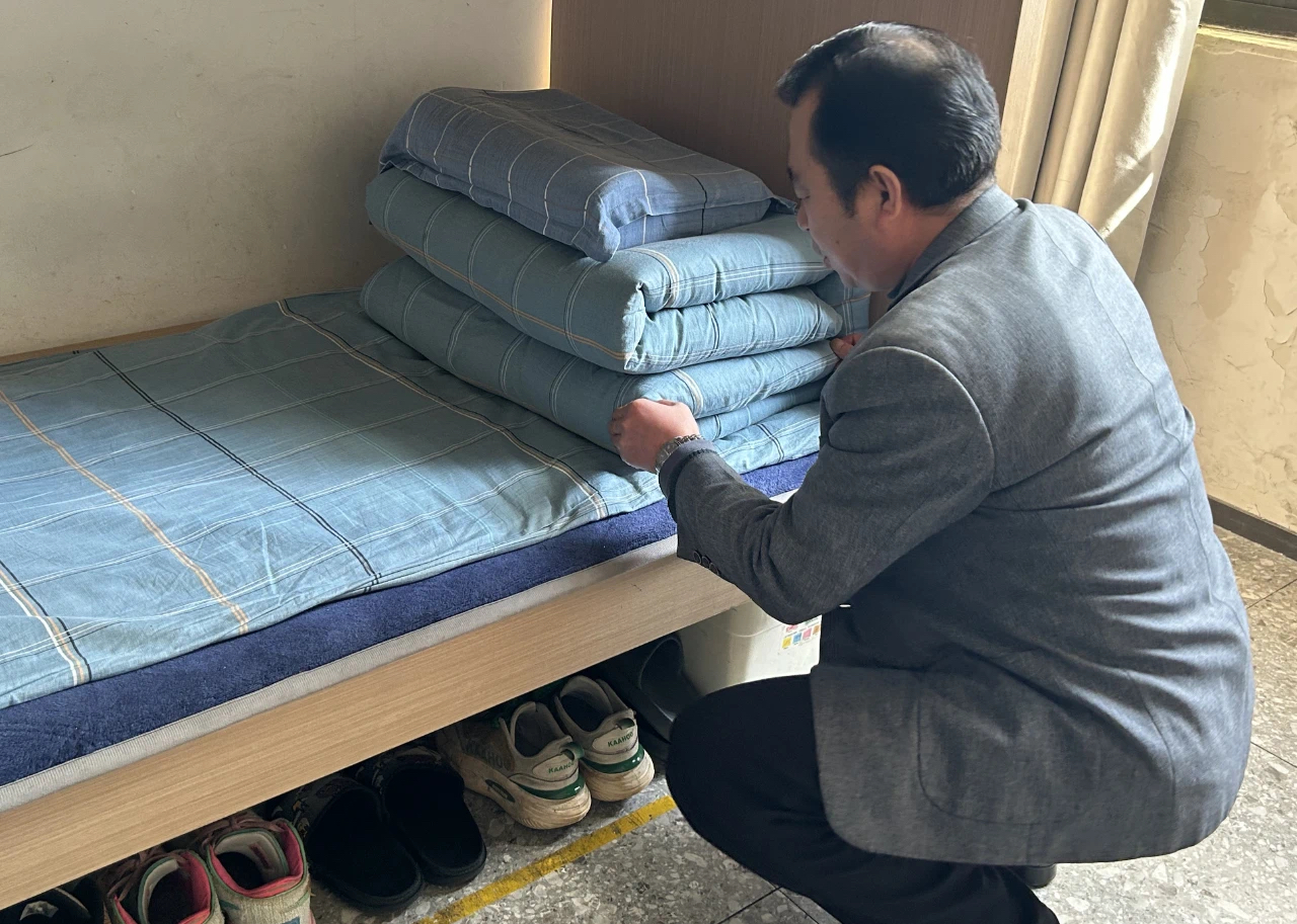 走访宿舍检查卫生也是重中之重,如果远远达不到整理标准线,余教官会在中午或晚上和这个宿舍的同学单独沟通、指导改正。“严格一点,是为培养学生自主能力和良好卫生习惯”,但更多时候,是在孩子们离寝后,帮忙打扫和整理孩子们顾及不到的地方,余教官自己也说到“毕竟高三的孩子了,要体谅他们学习任务重”。