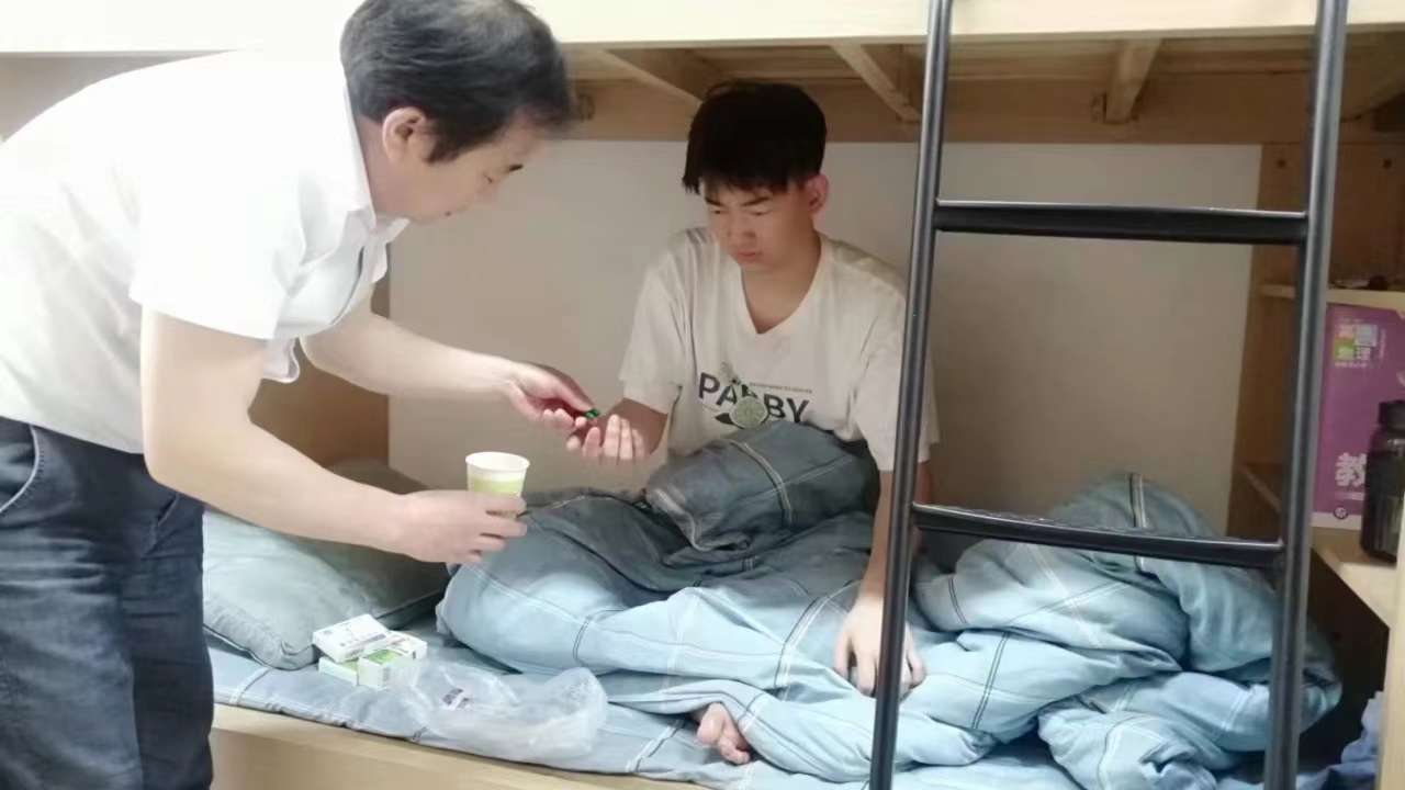 当有同学生病需要回寝室休息时,他也会早早守候在楼下,像一位可亲的长辈接回孩子,嘱咐他喝水吃药。有时也会出现生病的同学嫌药苦的情况,余教官就在一旁耐心劝导,说到这里,他哈哈笑起来“别看这么大,还是宝宝呢”,笑容背后却满满的都是对孩子们的爱。记得有个孩子需要按疗程吃药,药价比较高,家长担心孩子保存不当,就委托给了余教官帮忙保管、叮嘱吃药,“都是为人父母的,我都能理解,我多上心,家长们也就更放心。”余教官真诚地说道。