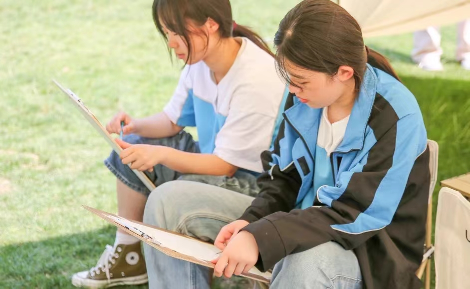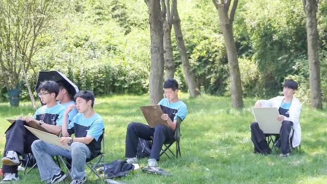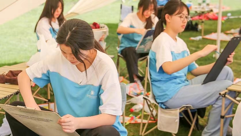 下午把写生课堂搬进自然风光里,一览藏在鸠兹湾的夏日静谧,捕获原生态的“意与境”,激发学子们的无限潜能,不用套路的笔触与颜色,只将自己的审美与感悟掺杂进颜料之中,遵循着老师的指导,去取景、去构图、去表达。