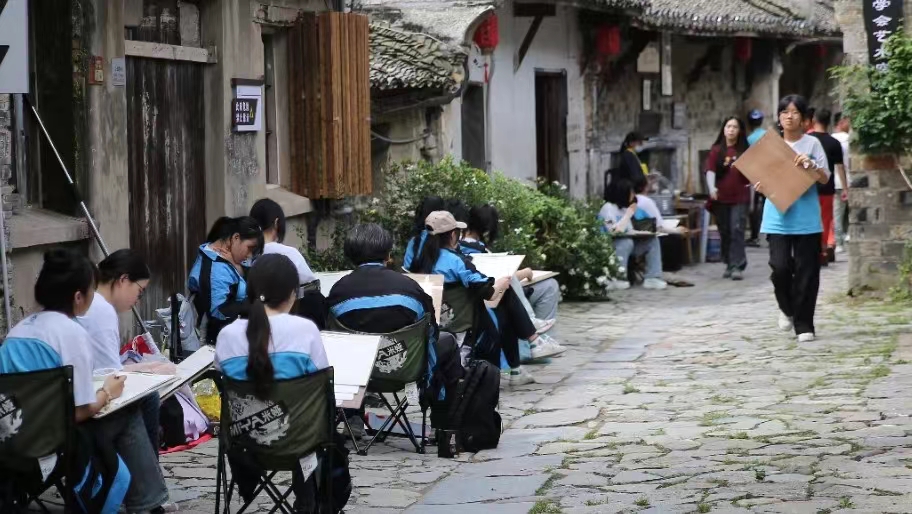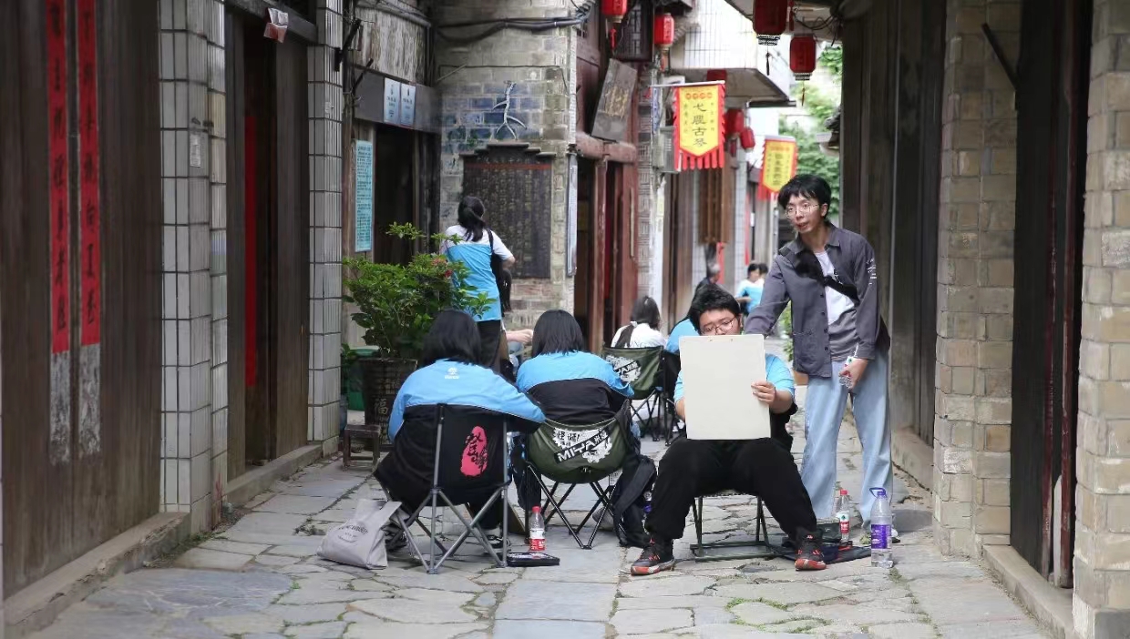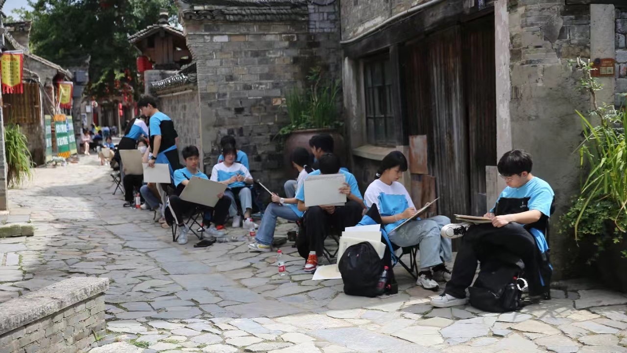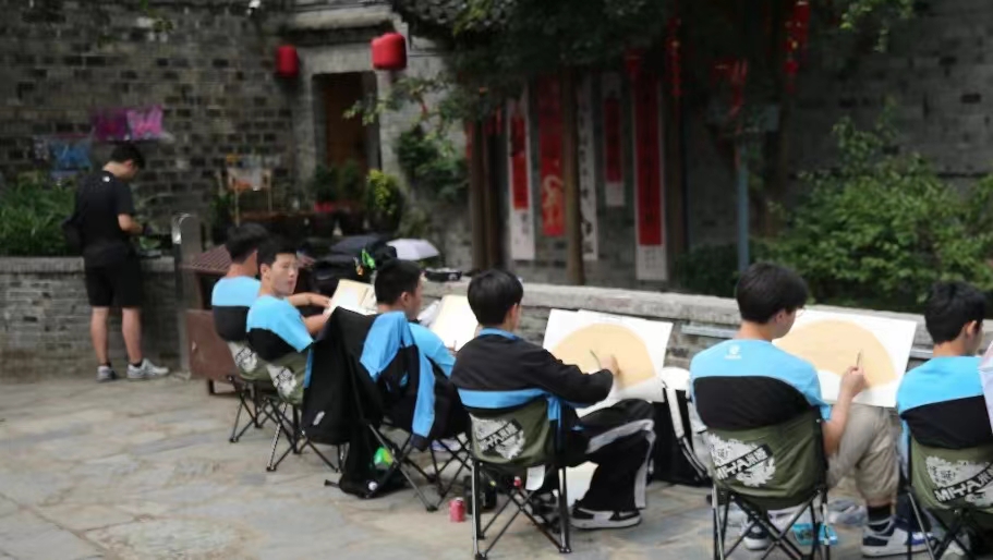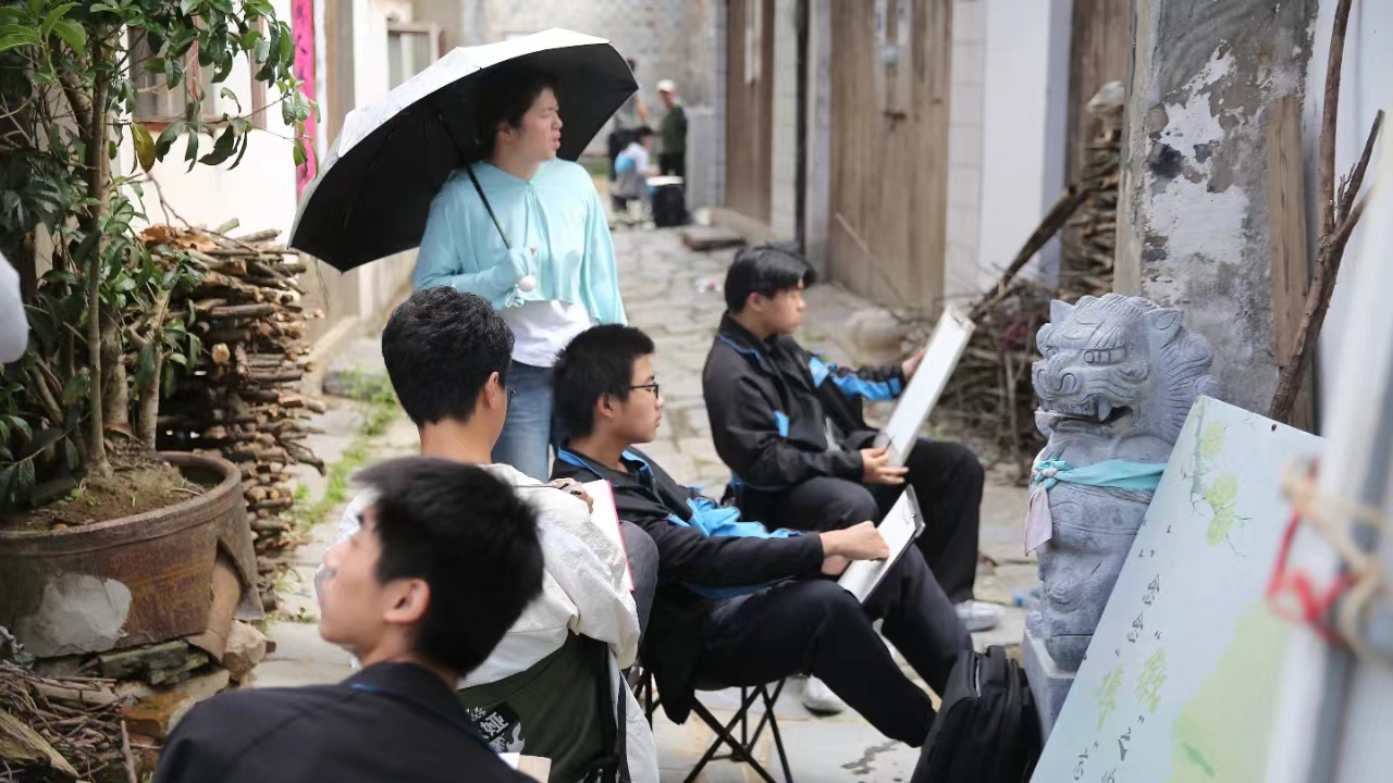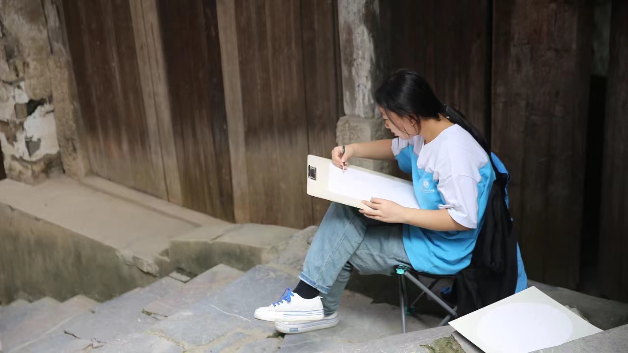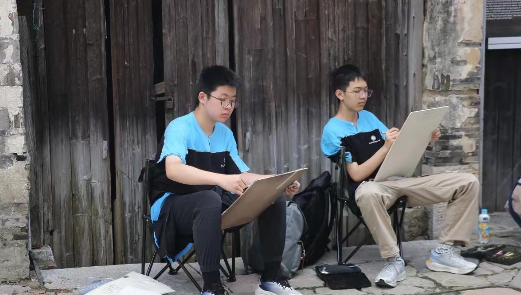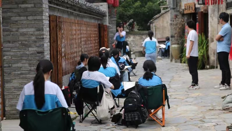 村村如画,步步为景,同学们无声息地,浸润在自然的调色板里,笔下的画面也愈发灵动。他们用画笔收集万物的形状,添置线条疏密,调出色彩浓淡,将西河古镇之美展现于方寸白纸之上,增添艺术的灵动与魅力。