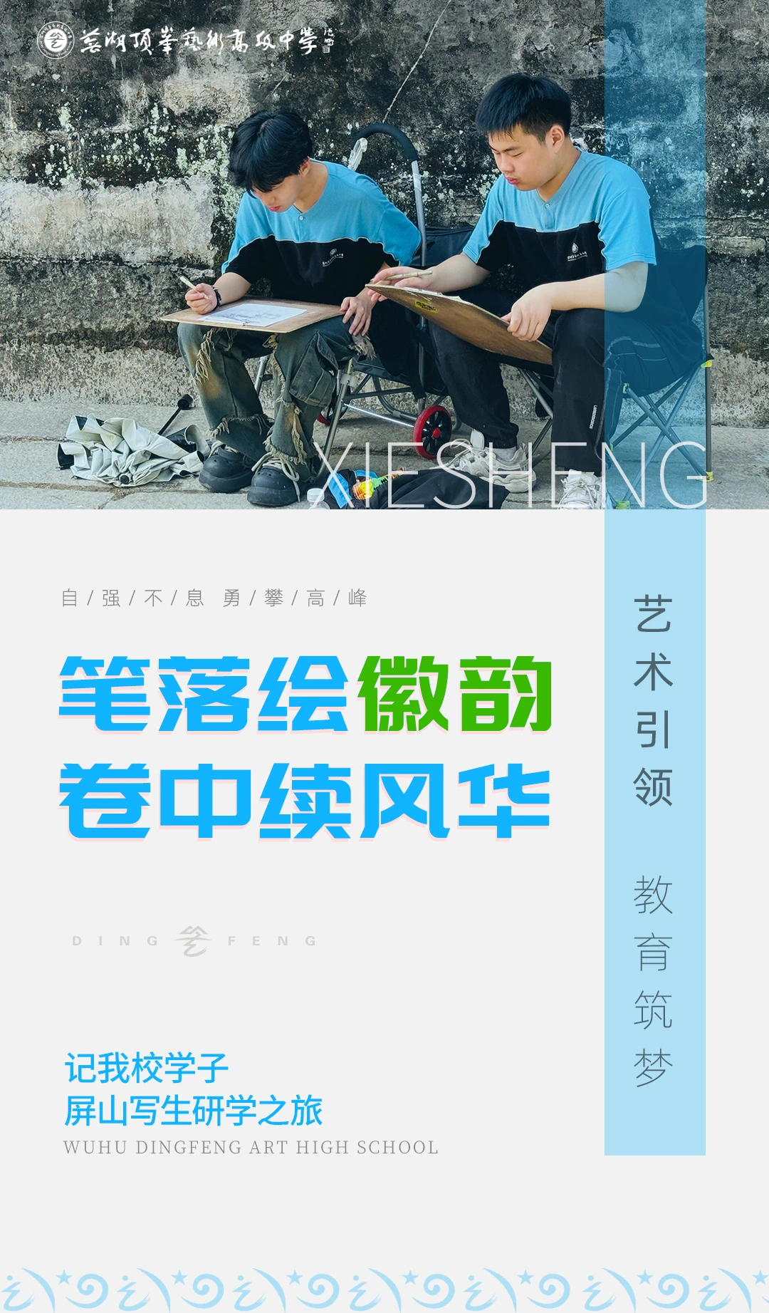 随着艺考改革,风景题材将广泛地出现在联考、校考、美院考试中,在色彩和速写教学体系中比重增大,所以风景在美术学习中变得至关重要,而走进户外亲身感受真实的自然场景,是练好风景的有效途径。 对于高三生来说,外出写生这门必修课不仅能让学生快速掌握风景色彩与速写写生的实战技巧,实现理论与实践的有效交融;更能让学生从容应对多变的美术高考试题,引导其深入生活对多重场景中的艺术之美进行感知、发掘和表现,拓宽学生的取材思维和艺术走向。 对此,此次屏山写生我们安排专业教师,对色彩风景和速写创作进行针对性教学。接下来让我们用一篇文章的时间,走进同学们笔下的山水世界。 PART.01 赴梦 · 秋遇屏山 探秘徽韵 徜徉于屏山的云雾青山间,流连于古村的皖南民居里,这一次,走出课堂,同学们将身心寄于美丽的乡村和山水之间;这一次,拿起画笔,在这绮丽的皖南风光中汲取灵感。 PART.02 追梦 · 步履不停 创作不止 沿着穿乡小路,背对古朴巷道,写生小分队总是一坐一整天,倾其心而投其身的写生创作:绘山间物、 追林荫光、寻溪涧色,凝聚成独属于自己的屏山印象。纸笔相接,每一次挥洒都是与自然的对话;磨练技艺,不断地用笔触丰富自己的画面。 PART.03 筑梦 · 良师相伴 日益精进 写生途中,同学们付出的是坚持和汗水,相伴的是老师们的鼓励和教导。或手把手教学指导,或俯身点拨解惑,老师们就地取材,将技巧与心得倾囊相授,同学们消化升华知识点,更快的将美术技巧运用到实景中。 △一张一张细致评析,逐个讲解击破难点 △每日评画环节,及时复盘调整教学计划 PART.04 游梦 · 纵情山水 峡谷漂流 PART.05 护梦 · 无微不至 艺路同行 出门在外,作为“临时家长”,顶峰艺高始终重视学生安全和教学管理,从出发前多次开会详细部署,多方联动保障安全;到写生路上的细微关怀,跨越清晨夜幕的时刻守护,只为不负同学所望,不负家长所托,学有所成,学有所获。 △ △恰逢中秋佳节送上月饼水果 积攒满满前进能量 上水果,为大家的写生补充满满能量 经历|此中甘苦。 镜头前留下你我合影与明朗笑容 积累技巧经验 在未来凝固释放在彼此的笔尖 我们征途不变 继续期待那些未完待续的梦想