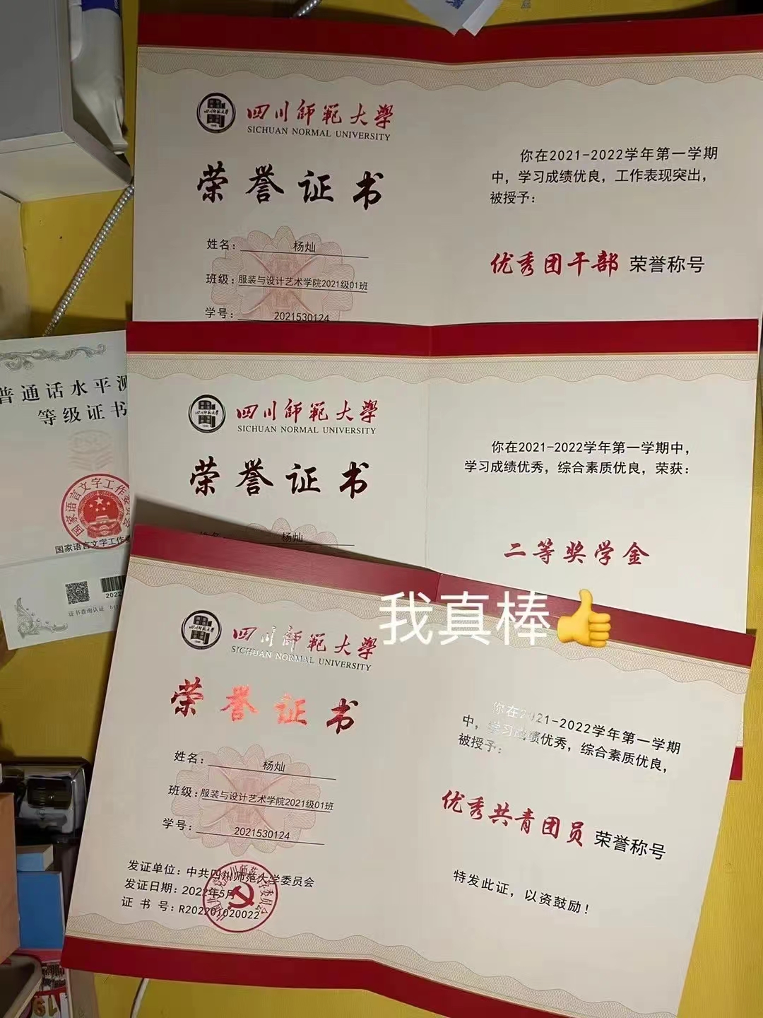 学习获奖:在大学期间连续三年班级第一,获得国家奖学金,5次一等奖学金,4次三好学生,两次优秀共青团员,1次优秀共青团干部。