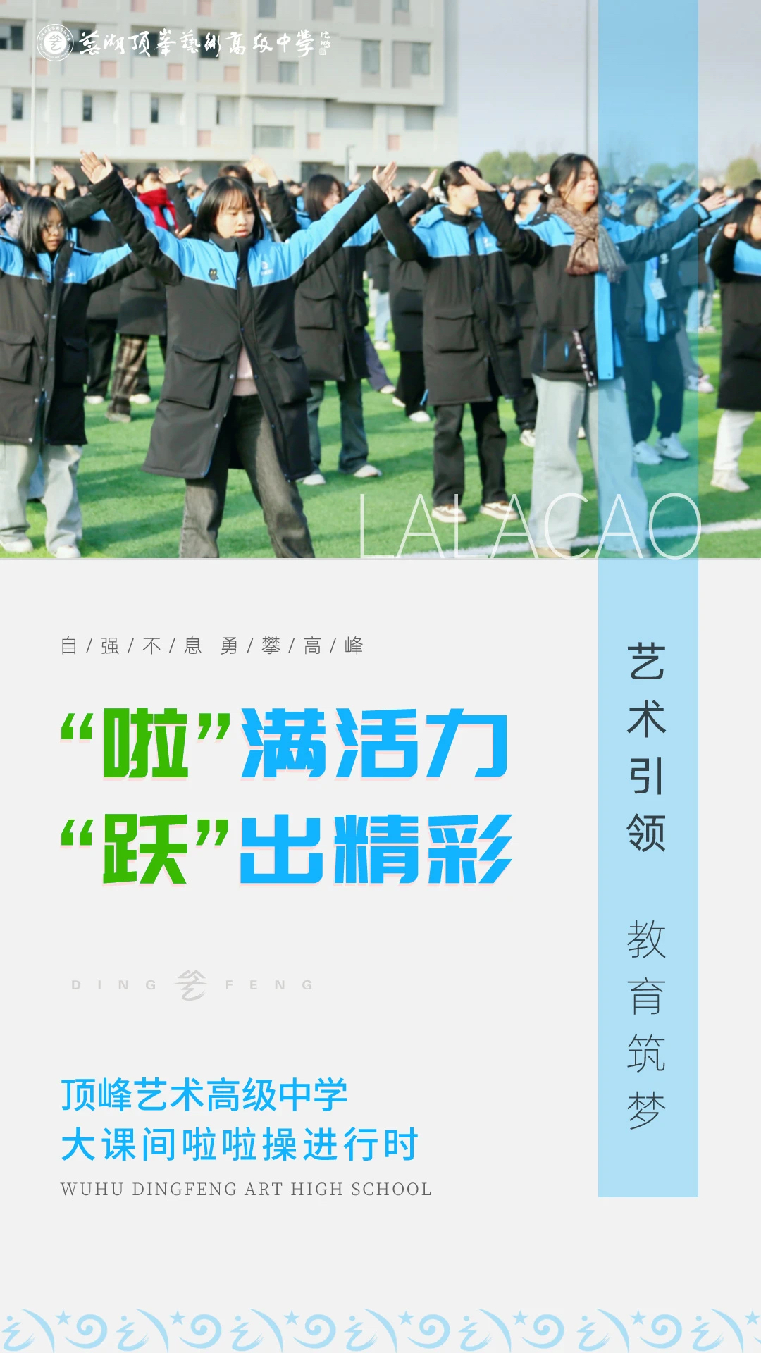 #SPORTS 阳光体育 体育是德育、智育、美育、劳育的基础,体育活动不仅是强身健体的途径,更是培养学生综合素质、塑造健全人格的重要基石。顶峰艺术高级中学始终秉持全面发展的教育理念,着眼于学生身心健康全面提升,坚持开展“阳光大课间”活动,积极引导学生们拥抱阳光、投身运动、享受健康、品味快乐,这也是我校六项校本教育——养成教育的体现。 当铃声响起,班级队伍整齐集结 蓝天白云的操场,活力运动的少年