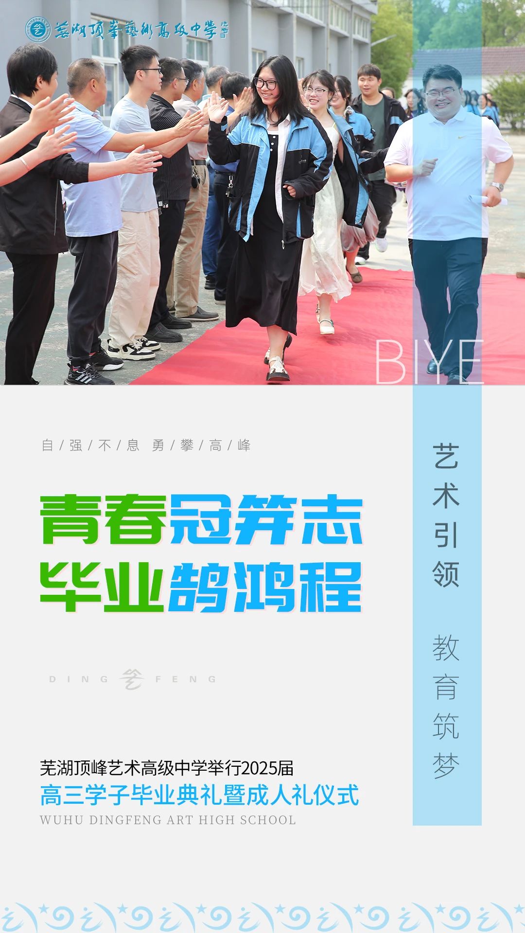 光阴三载,白驹过隙;毕业时节,骊歌轻扬。犹记2022年盛夏,怀揣艺术理想的你们踏进顶峰校园,自此开启了一段追星赶月的奋斗征程。晨光里的画笔沙沙,深夜中的灯火长明,都是青春最美的印记。 6月4日上午,芜湖顶峰艺术高中举行2025届高三毕业典礼暨成人礼仪式。既是对拼搏岁月的回望,更是为即将迎接高考检阅的高三学子们献上祝福,愿你们带着师长嘱托、同窗情谊,在更广阔的天地间绽放艺术光彩! 国歌嘹亮/忆往昔并肩 青春飞扬,纵马驰骋向朝阳 全体师生起立齐声高唱国歌 2025届学子们第一次 以成年人的身份向祖国报到 随着同学们哼唱的旋律轻轻响起 记忆如花在荧幕绽放 往昔时光化作光影流淌 每一帧都是我们的青春 谆谆寄语/嘱托伴远航 人生旅途的每一次拔节生长 都浸润着无数温暖的守护目光 三尺讲台的谆谆教诲 家中灯火的殷殷期盼 同窗并肩的砥砺同行 让求知岁月焕发璀璨光芒 启程之际,请带上这些温暖的叮咛 愿这些祝福化作你们前进的勇气 铭记于心上,珍重于路上! 师生献礼/助梦放光芒 学弟学妹们献上青春洋溢的励志表演 为即将高考的学长学姐们加油助威 愿你们以笔为剑,自信迎考 在青春的考场上绽放最耀眼的光芒! 高三全体班主任深情献唱《明天会更好》 用歌声传递祝福: 愿你们考场挥毫如行云流水 答卷落笔似锦上添花 鞠躬铭恩/润泽展鹏翼 三尺讲台育桃李,一支粉笔写春秋 师恩化羽托鹏翼,莘莘学子秉初心 此刻,优秀毕业生昂首登台 将三载拼搏化作荣耀绽放 一份荣誉,一份成长,永载青春 宪法为誓/担当启新程 校领导将《宪法》郑重交到学生手中 象征着成人路上沉甸甸的责任与荣光 让法治的信仰与青春的誓言在此交汇 十八而立,肩负使命 在这庄严的时刻 顶峰高三学子以青春之名宣誓 志存高远,做敢追梦、敢拼搏的顶峰人 心怀家国,做有热血、有担当的新青年 成人门下/步履正铿锵 跨越成人门,自立从此始 在师长的欢呼与掌声中完成青春蜕变 与父母携手同行的每一步 都在见证着成长的足迹 以笔为证,以心为誓 横幅之上,落笔坚定 这是成年的第一份郑重承诺 带着成人礼的洗礼与成长 怀揣勇气与担当奔赴考场 愿你们在高考战场上全力以赴 顶峰学子,未来可期! 当毕业的钟声与成人的礼赞交织 2025届学子正迈向人生的新航向 在高考这一战 愿同学们以笔为剑,锋芒毕露 在人生这一站 愿同学们以梦为马,步履铿锵 -- 始终昂首前行,不负韶华 奔赴那片繁花簇拥的未来!