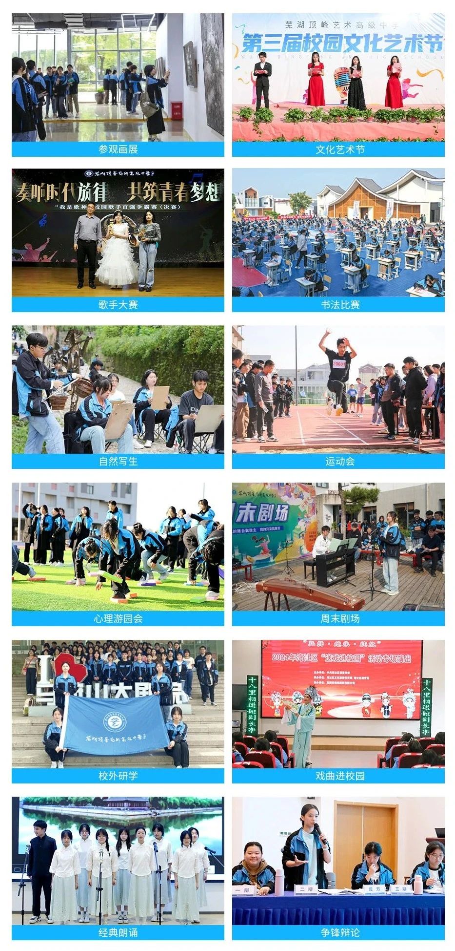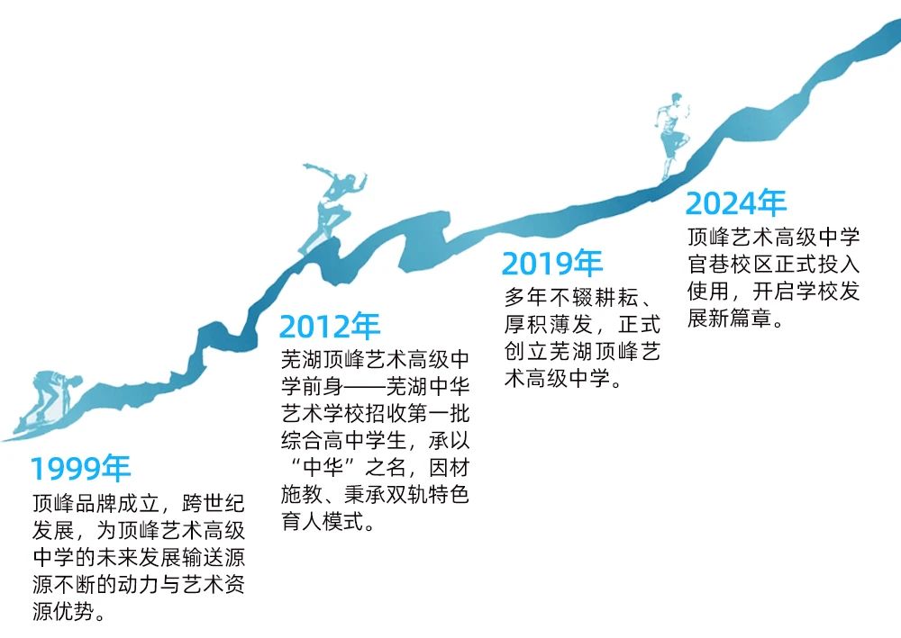 芜湖顶峰艺术高级中学,由“中国好人”“全国自强模范”夏云兴先生于2019年创办,隶属安徽顶峰艺创集团,是芜湖市教育局直属的一所全日制艺术高中。学校依托顶峰艺术培训二十余年积淀的深厚基础,在艺术教育领域积累了丰富的管理经验。同时,学校树立了以爱为底色的教育理念,专注于为学生提供全方位、系统化的艺术培养。