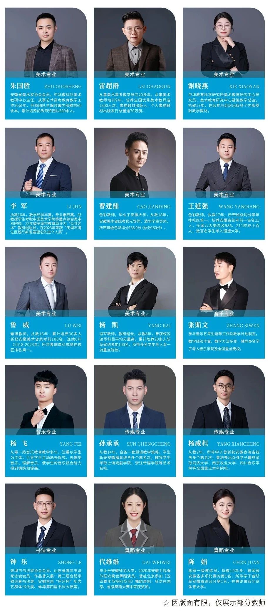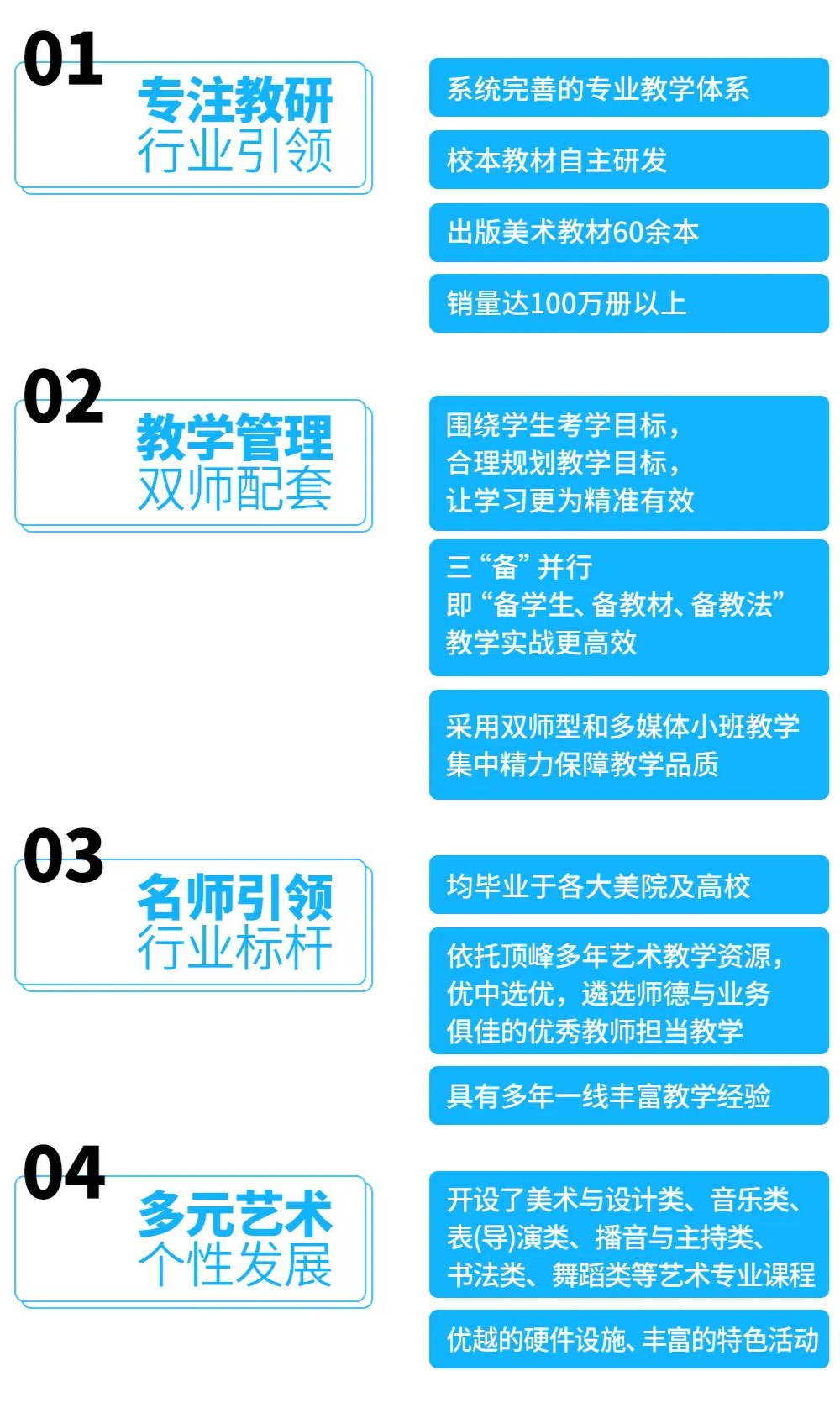 凭借“把不可能变成可能”的教育韧劲,先后向中国美术学院、四川美术学院、广州美术学院等国内知名艺术高校及北京师范大学、华东师范大学、吉林大学、中南大学、山东大学等985、211综合类重点大学输送了一批又一批的优秀艺术学子。无论是基础薄弱者的逆势突破,还是天赋优异者的持续精进,我们始终以多元化育人理念,助力每位学子实现艺术梦想,让人生更精彩!