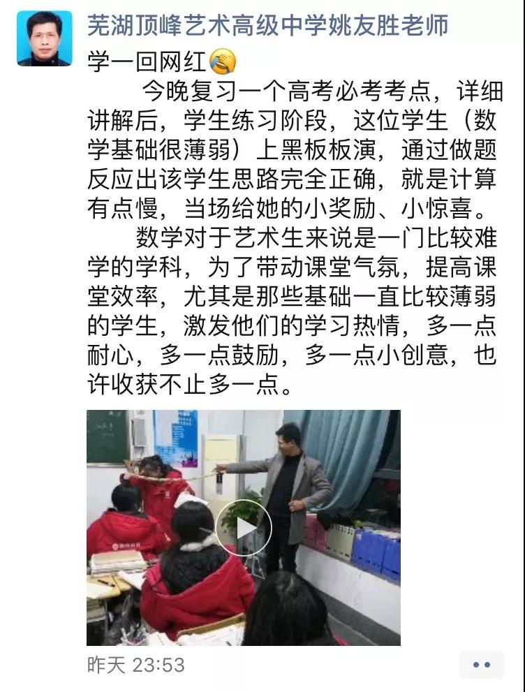 “为应对2020届文化课艺术生分数线上涨,我校高三现阶段根据艺考生的专业课和文化课的实际情况,对每个学生进行精细摸排,分流教学。我们数学教研组更是从高考必考知识点出发,充分发挥我校的“预—展—练—清”高效课堂模式,综合考虑,全面安排,严格落实。