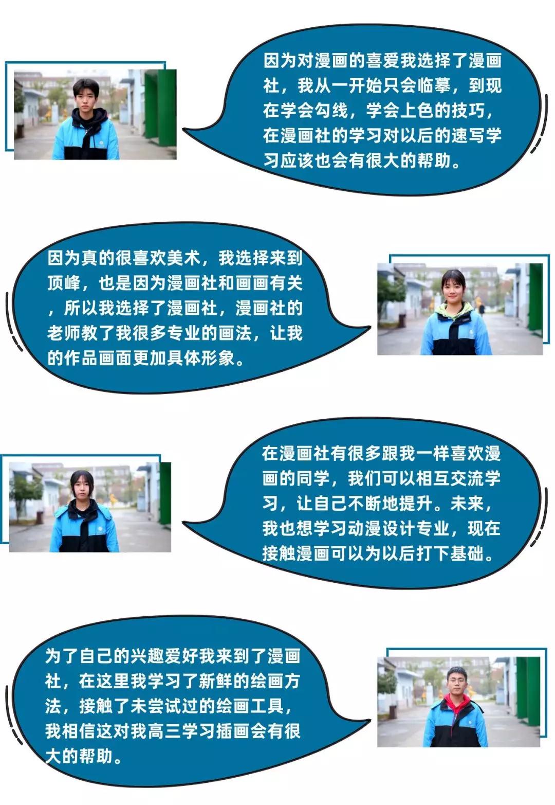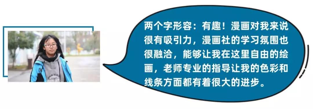 “我们漫画社团的核心是引导学生“关注生活,热爱生活”,利用学校的资源,结合学生实际,给大家制造实践的机会。同时“衔接高考”也是社团活动背后一个重要目标。我们的学生心里都有一个美院梦,很多美院考试时都会加入设计科目,加入社团后老师会了解学生的理想院校,在指导过程中,一对一的把漫画兴趣与院校考学结合,让学生真正做到‘酷玩酷学’。”